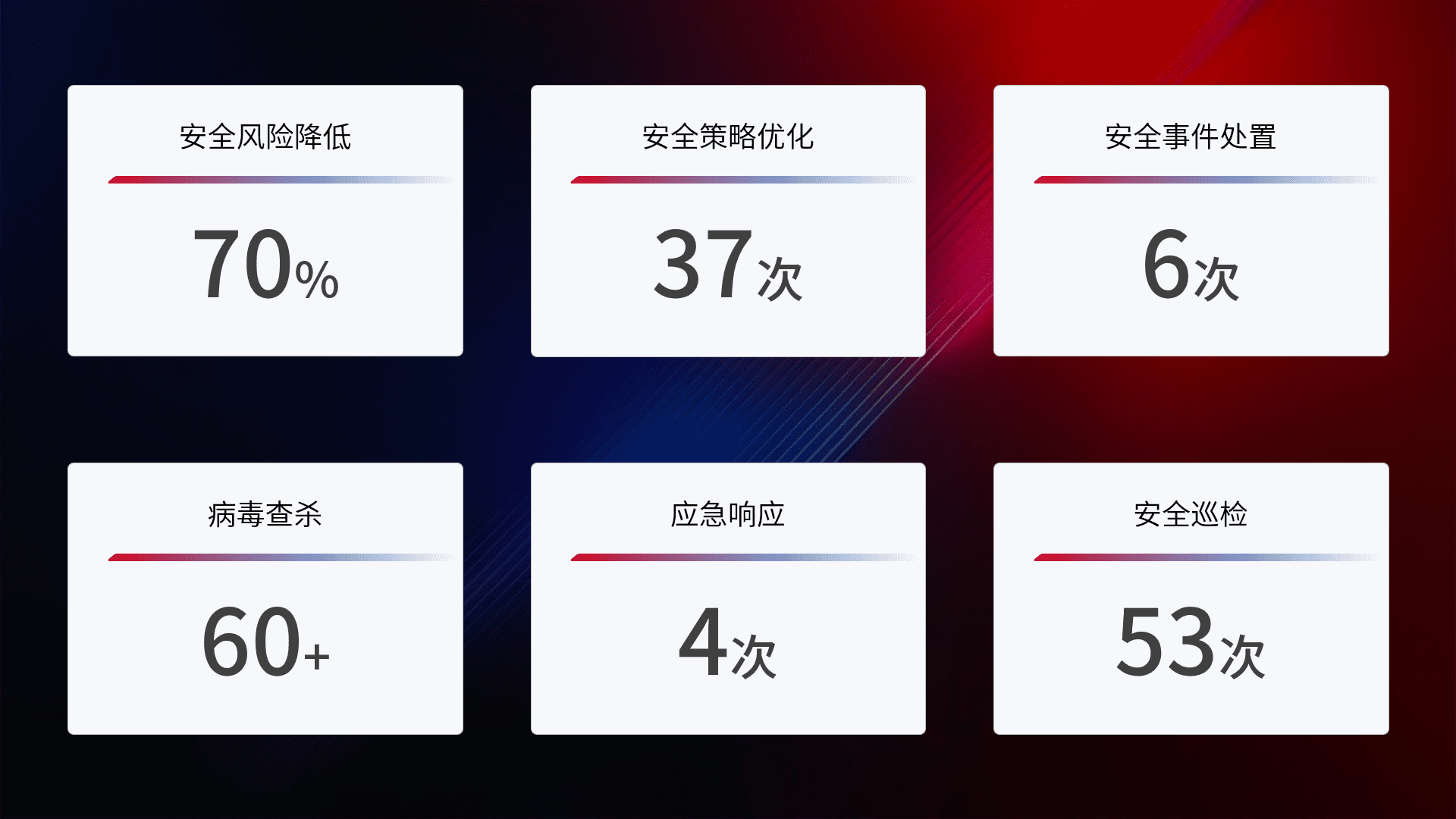 提供全面的安全事件报告体系,,,,包括处置报告、、周报、、、、季度和年度总结,,,结合持续监控,,帮助客户深入了解网络安全状况。。